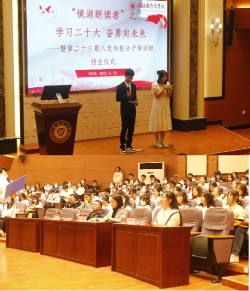 11月25日晚,国际医药商学院在江宁校区经管文楼111报告厅举办镜湖朗读者之“学习二十大,奋勇向未来”暨第二十三期入党积极分子培训班结业仪式。学院党委书记丁素军及培训班全体学员参加此次活动。