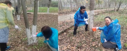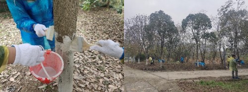 此次劳动实践党日活动在基建后勤处的大力支持下开展。活动开始前,基建后勤处的负责老师对冬季植物养护工作明确了详细的劳动劳动要求。活动当天,学院80余名师生党员认真投入劳动实践,大家两两一组、分工协作,按照统一标准为树木进行涂白。
