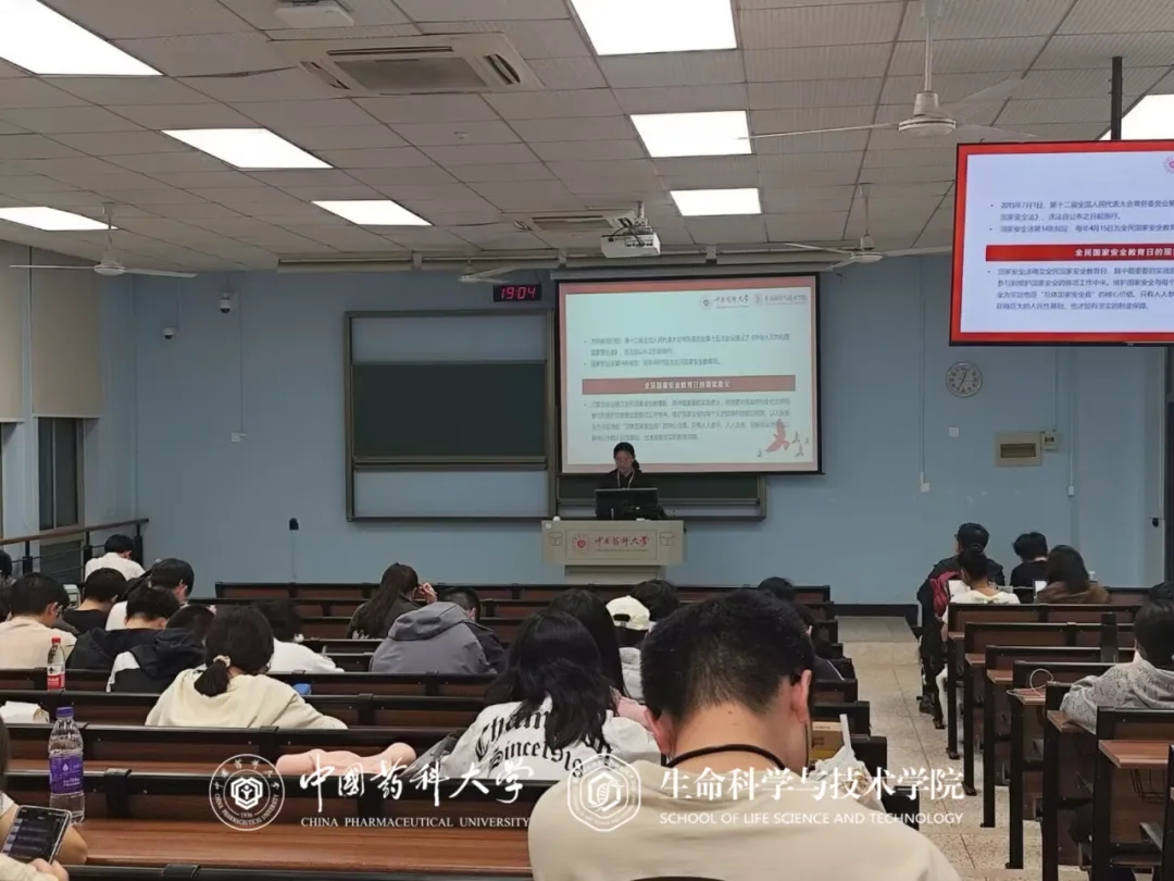 接着,生科院团委代表李思圆同学为大家讲解国家安全日及国家安全与药学生的联系。主讲人先介绍了国家安全日的由来和意义,解读了国家安全的内容,分析了国家医药安全领域的典型案例。最后,她从药学专业出发,分析药科学子如何维护国家安全。她总结道,国家安全并非遥不可及,而是紧密关联社会生活的各个方面,所以同学们要牢记“精业济群”的校训,为维护国家安全贡献力量。
