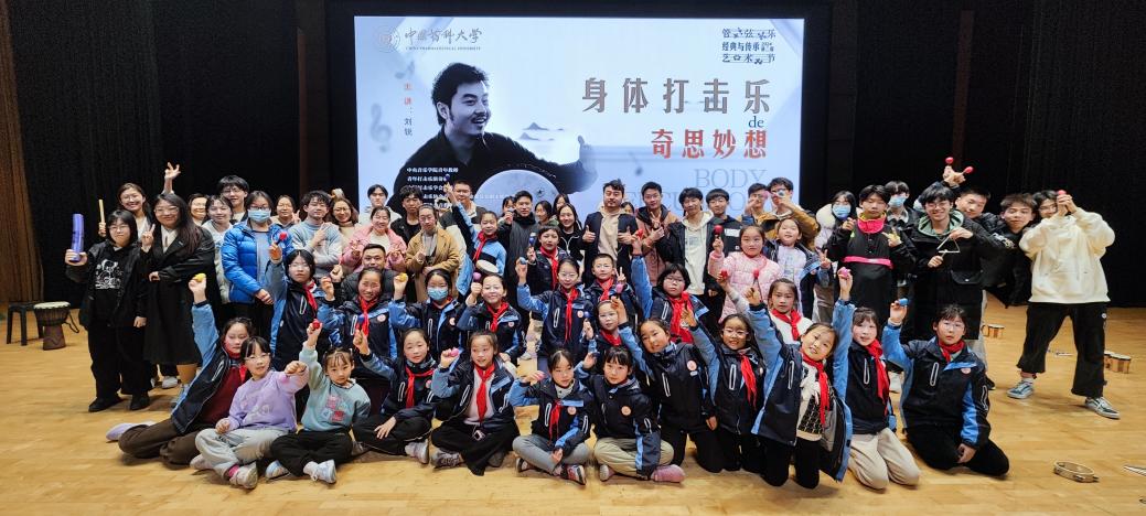 讲座中,刘锐老师引导同学们通过拍手、跺脚等简单的身体动作创造出各种声响,并与音乐节奏相互呼应。期间,刘锐老师还通过运用多种小件打击乐器和动作编排相结合,鼓励同学们加入即兴创作的动作元素,带领同学们创造性的完成多个打击乐合奏小品,引导同学们深入体验音乐与肢体的紧密联系。这种独特的讲座形式帮助同学们以全新的视角更为直观地感知音乐的节拍、节奏和韵律,体验到了身体打击乐的魅力和乐趣。
