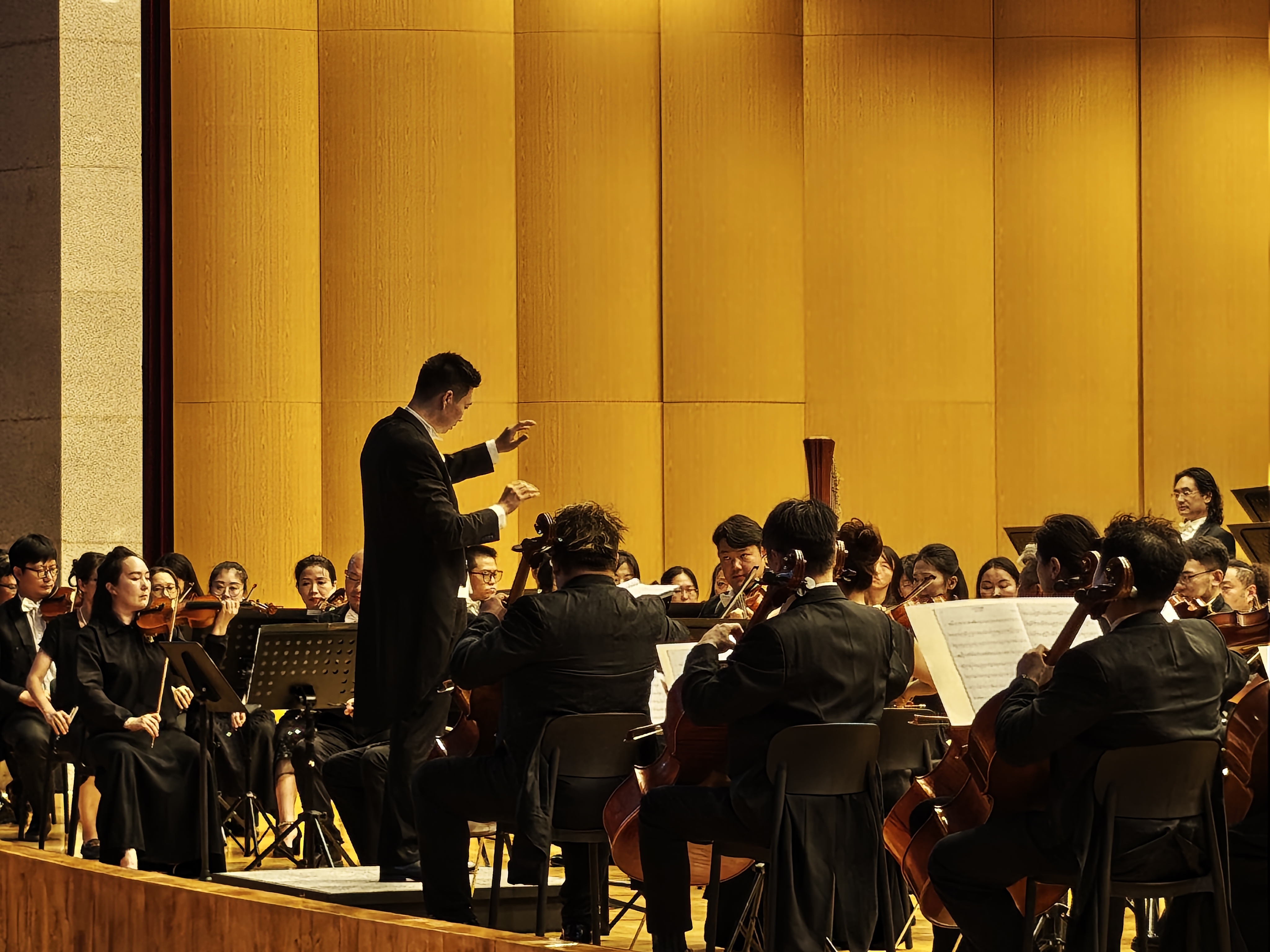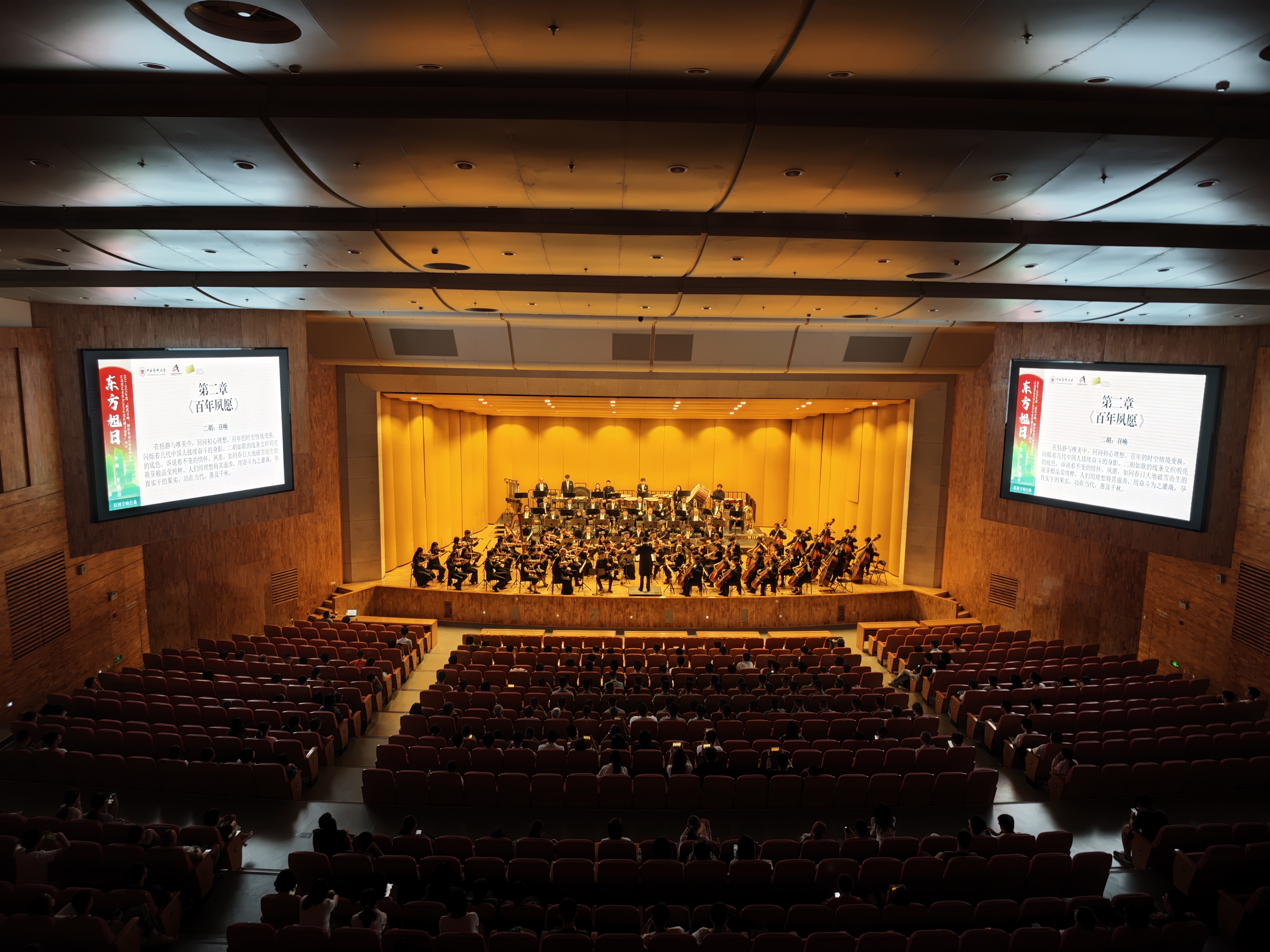 原创交响套曲《东方旭日》通过《可爱的中国》《百年夙愿》《沧桑巨变》《大道如砥》《复兴之光》五个篇章描绘了中华民族百年奋斗、复兴崛起的宏伟蓝图,奏响了中国共产党引领中华民族伟大复兴的壮丽篇章。音乐会由指挥家陈弘俊挥棒,以准确有力的手势把近百人乐团调动、汇聚,磅礴的声浪在我校礼堂冲天而起。音乐会特邀古琴演奏家艾鹏飞、二胡演奏家召唤、竹笛演奏家袁梓诚、唢呐演奏家徐高峰在套曲前四章分别独奏。当晚,全体演奏家们不仅展现出了精湛的技艺和极高的默契度,更是倾注了全部的热情和力量,将音乐的情感表达推向了巅峰,让师生们看到了如深情的诗一般的音乐中述说着的对祖国无尽的爱与敬仰。乐曲终了,礼堂内响起了雷鸣般的掌声和欢呼声。