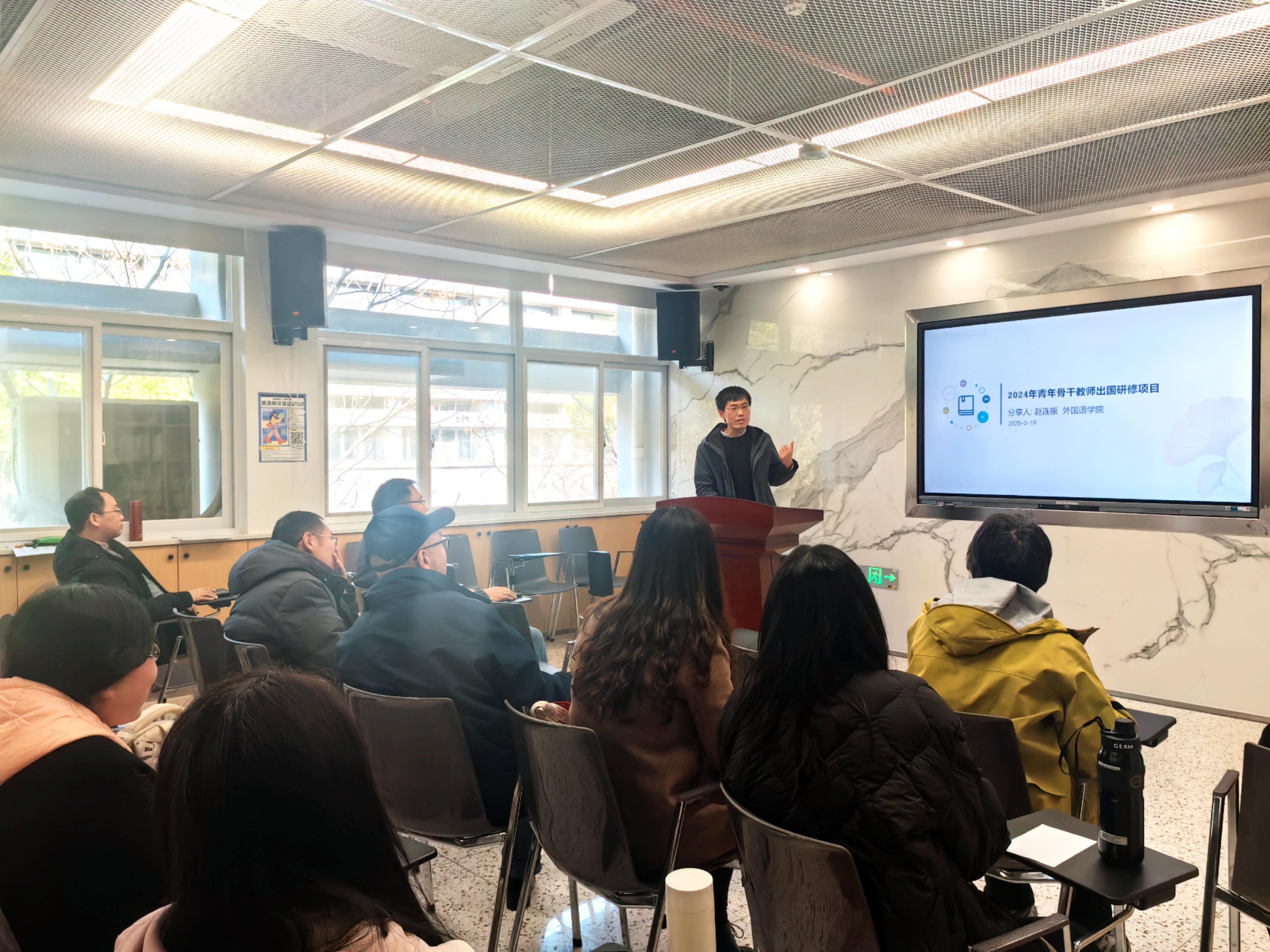 近期,外国语学院在经管文楼英·悦空间组织举办了2024年度高等学校青年骨干教师访问学者归国交流分享会,刚从英国萨里大学(University of Surrey)访学归国的赵连振老师分享了在英国研修一年中的生活、工作、学习经历,大学英语教学部全体教师参加。