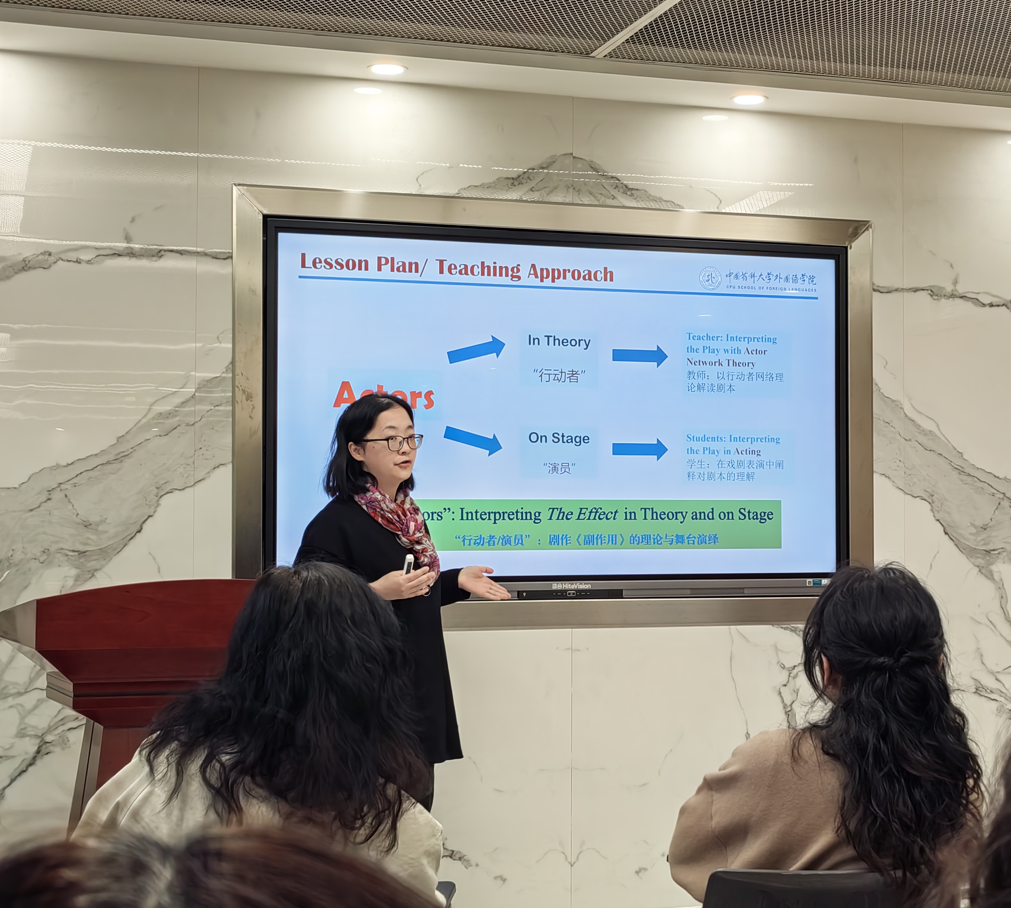 刘露老师则以“英语戏剧”课程为例,分享了“Actors: Interpreting The Effect in Theory and on Stage”。她引入“行动者网络理论”,引导学生从理论与舞台实践双重视角解读剧本《副作用》。课程设计中,学生不仅分析文本,还自编自演六种不同结局,展现出在“读”与“演”中平衡思辨与体验的教学创新。