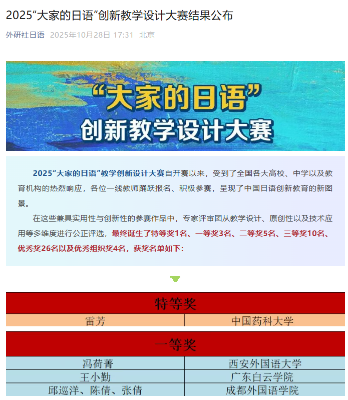 近日,2025“大家的日语””创新教学设计大赛圆满落幕。该赛事由高等学校大学外语教学指导委员会日语组等指导、外语教学与研究出版社主办,以“智慧赋能,创新教学”为主题,旨在推动日语教学数字化转型。我院雷芳老师凭借优质教学作品,在全国多所院校及教育机构教师的角逐中脱颖而出,斩获特等奖。