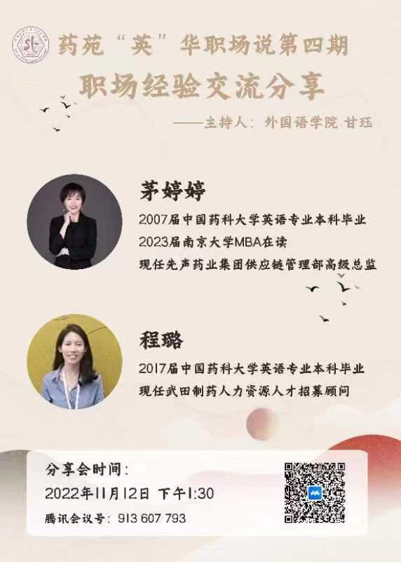 11月12日,外国语学院药苑“英”华第四期优秀院友经验分享会之“职场精英篇”成功举办。本次分享会邀请了2007届优秀毕业生茅婷婷和2017届优秀毕业生程璐分享了有药学特色的英专生职场经验。外国语学院院长赵光慧、辅导员以及近200名同学参加了此次会议。