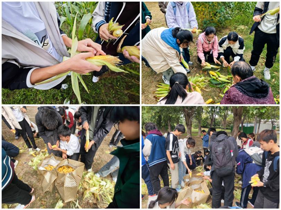 活动首先聚焦劳动教育田玉米种植与采收。师生们分工协作,在基建后勤处老师的指导下,戴手套辨果穗、弯腰掰玉米、分类装袋清理秸秆。老师实操讲解玉米生长周期与培育技巧,学生们在汗水里体会“春种秋收”的不易,采收的玉米装满十余袋。
