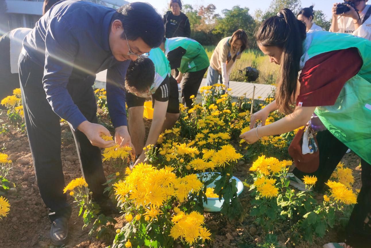 师生共同采摘金丝黄菊