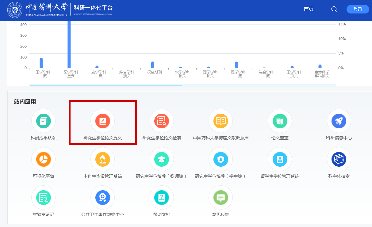 打开“世界杯直播科研一体化平台”(https://srip.cpu.edu.cn/#/home)(图1),点击“登录”按钮,输入账号密码,进入系统后找到“研究生论文提交”栏目(图2),点击后进入“世界杯直播学位论文管理系统”(图3),填写提交学位论文的题录、文摘等信息并上传电子版论文。