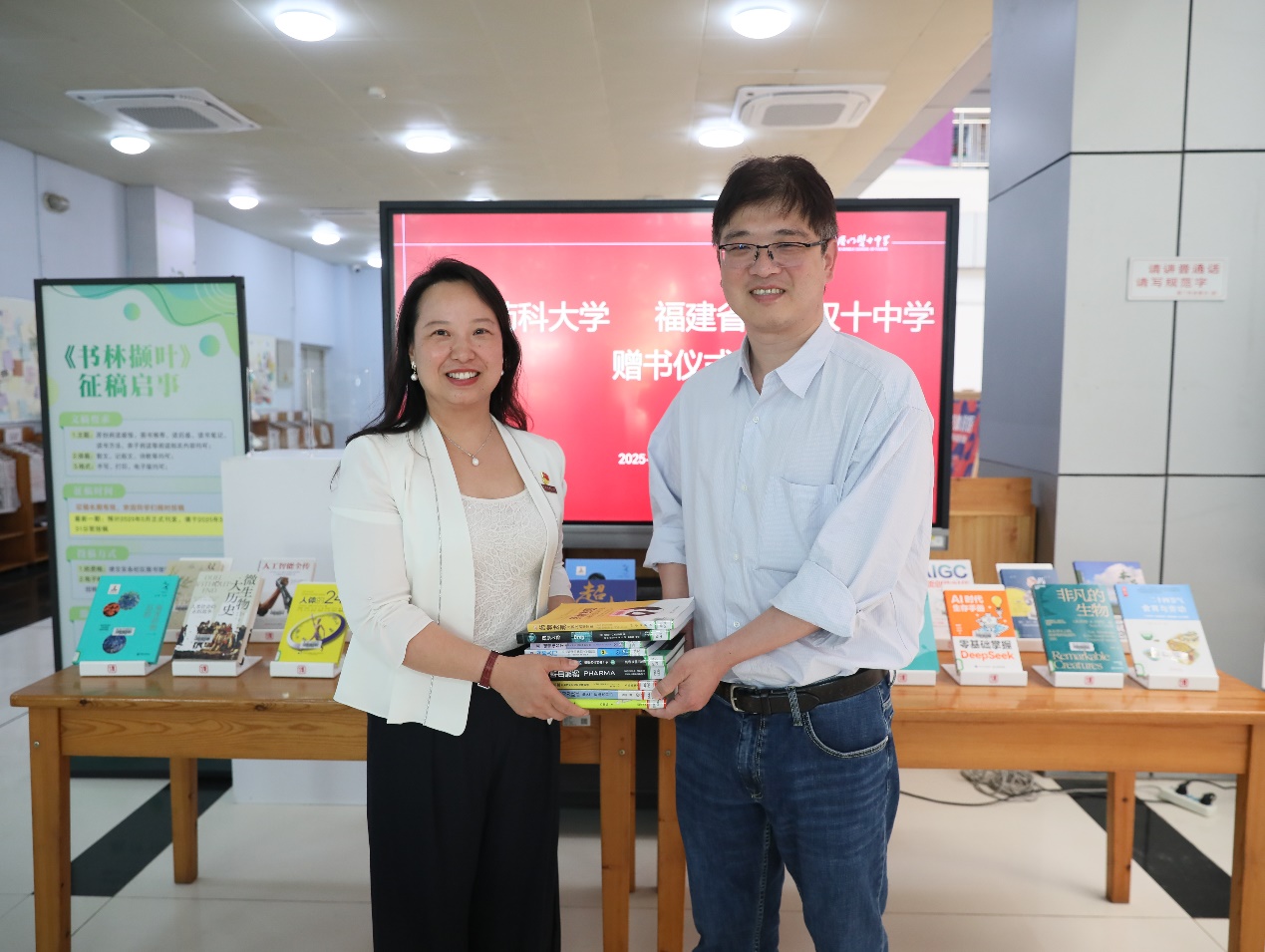 期间,黄艳代表图书馆向厦门双十中学捐赠了一批药学、医学、生物学、心理学、人工智能相关图书,为高中学子送上“精神食粮”,让高中学子们感受到药学知识的魅力,增进对药学行业、大健康产业的了解。捐赠仪式上,黄艳书记分享了世界杯直播图书馆在文化育人方面的举措,期待以世界杯直播图书角为纽带,推动两校文化共建。