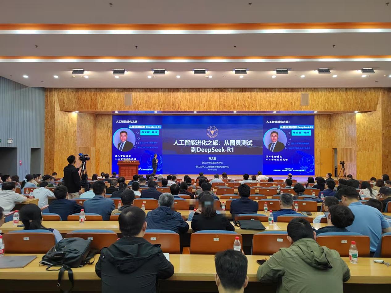 会上,陈文智以《人工智能进化之旅:从图灵测试到DeepSeek-R1》为题作报告。他从“技术演进、场景应用、未来展望”三维视角,系统阐述了人工智能发展规律,纵向梳理生成式AI、大模型等关键技术的代际跃迁,横向解析“浙大先生”智能教育平台的高校应用范例,前瞻性提出AI驱动经济、社会发展的创新场景。他以“理论建构+实践解码”的方式,为药学教育数字化发展提供了可操作的实施路径。报告既有理论深度又有案例运用,有助于提升我校教职工的人工智能应用能力。