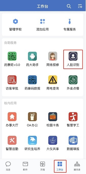 您可以在企业微信【工作台】-【人脸识别】应用自助添加或更换照片用于校园门禁通行,如在人脸门禁识别过程感觉识别速度较慢或需多次识别时,依自身需要可按照下面的操作步骤进行人脸识别照片的更换。