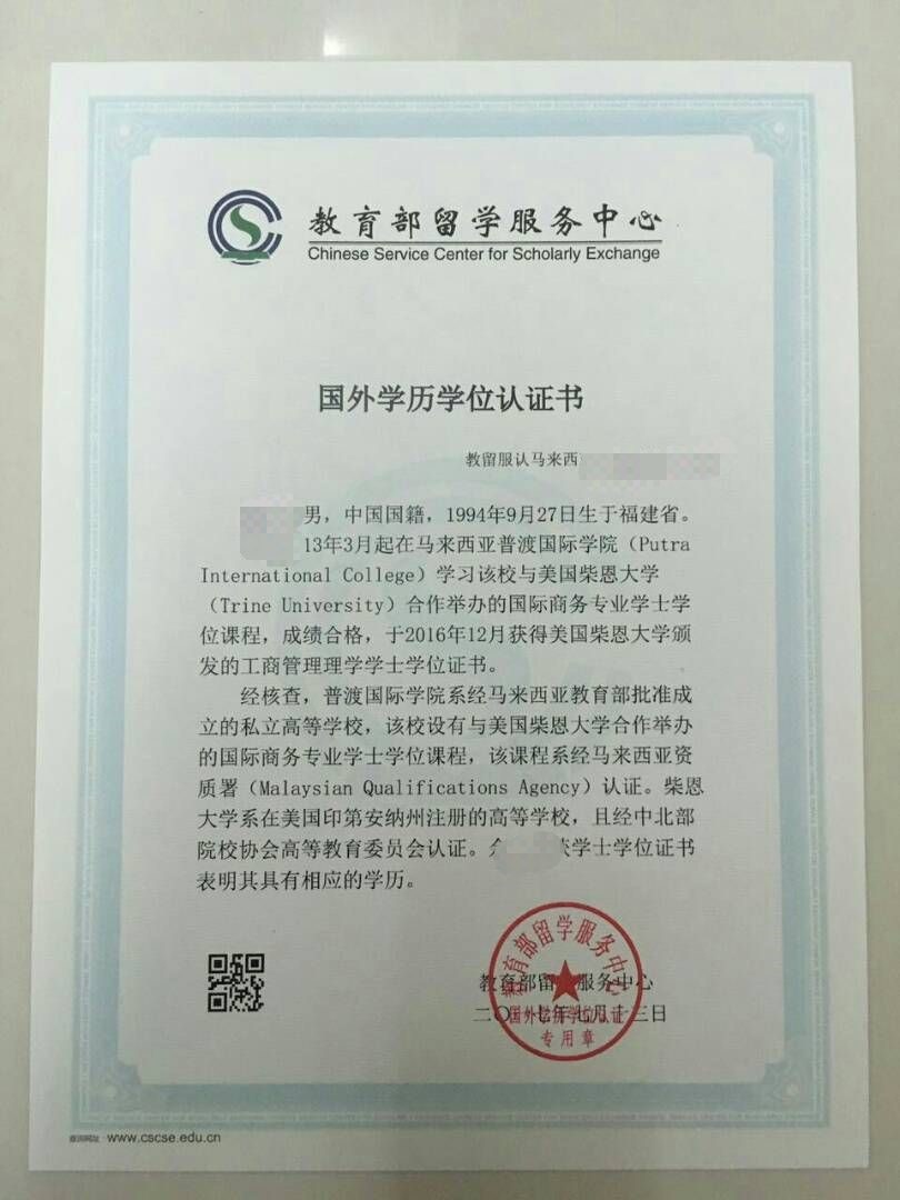 教育部留学服务中心出具的认证报告照片示例