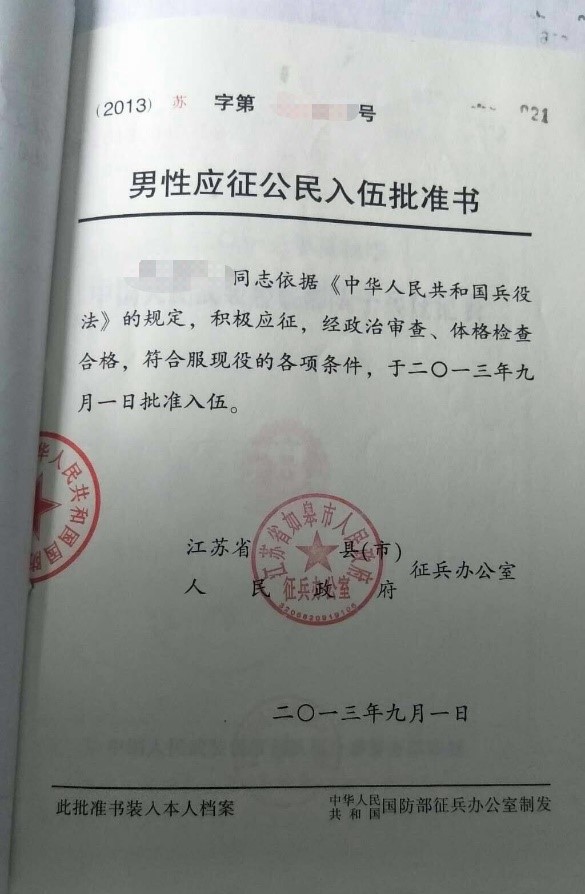 入伍批准书照片示例(报考退役大学生士兵专项计划的考生提供)