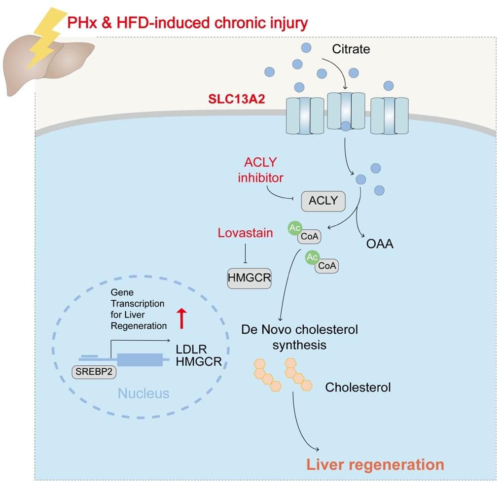 肝细胞分裂的代谢需求是肝损伤后再生的前提条件。尽管大量数据揭示了肝脏再生过程中的转录动态调控,但其与代谢重塑之间的联系仍然知之甚少。研究团队通过整合现有的转录组数据,发现膜转运蛋白SLC13A2是肝大部切除术(PHx)后肝脏再生的关键调节因子。SLC13A2的表达在PHx术后迅速降低,并随着肝脏重量和生理功能的修复而逐渐升高至正常水平。研究团队通过构建肝脏特异性过表达或缺失的小鼠模型,证明SLC13A2促进PHx术及HFD饮食长期喂养造成慢性损伤而诱导的肝再生。机制研究表明:SLC13A2转运柠檬酸,柠檬酸经ACLY催化裂解释放乙酰辅酶A用于胆固醇合成,促进SREBP2活化及胆固醇代谢相关基因(LDLR、HMGCR等)的表达。HMGCR抑制剂洛伐他汀抵消SLC13A2促进的肝脏再生。此外,ACLY抑制剂通过抑制SLC13A2介导的柠檬酸裂解,抑制胆固醇合成,阻遏肝细胞增殖和肝脏再生。研究团队由此提出:由SLC13A2转运的柠檬酸作为中间代谢物恢复肝脏再生的代谢平衡,有望成为减轻肝损伤、促进肝修复的潜在药物靶标。