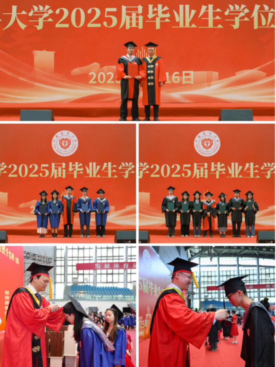 在激昂的音乐声中,毕业生们身着学位服、头戴学位帽,依次走上主席台,院长吴照球、副院长杨鹏、柯学、刘东飞共同为本院毕业生拨穗正冠,颁发学位证书并合影留念。