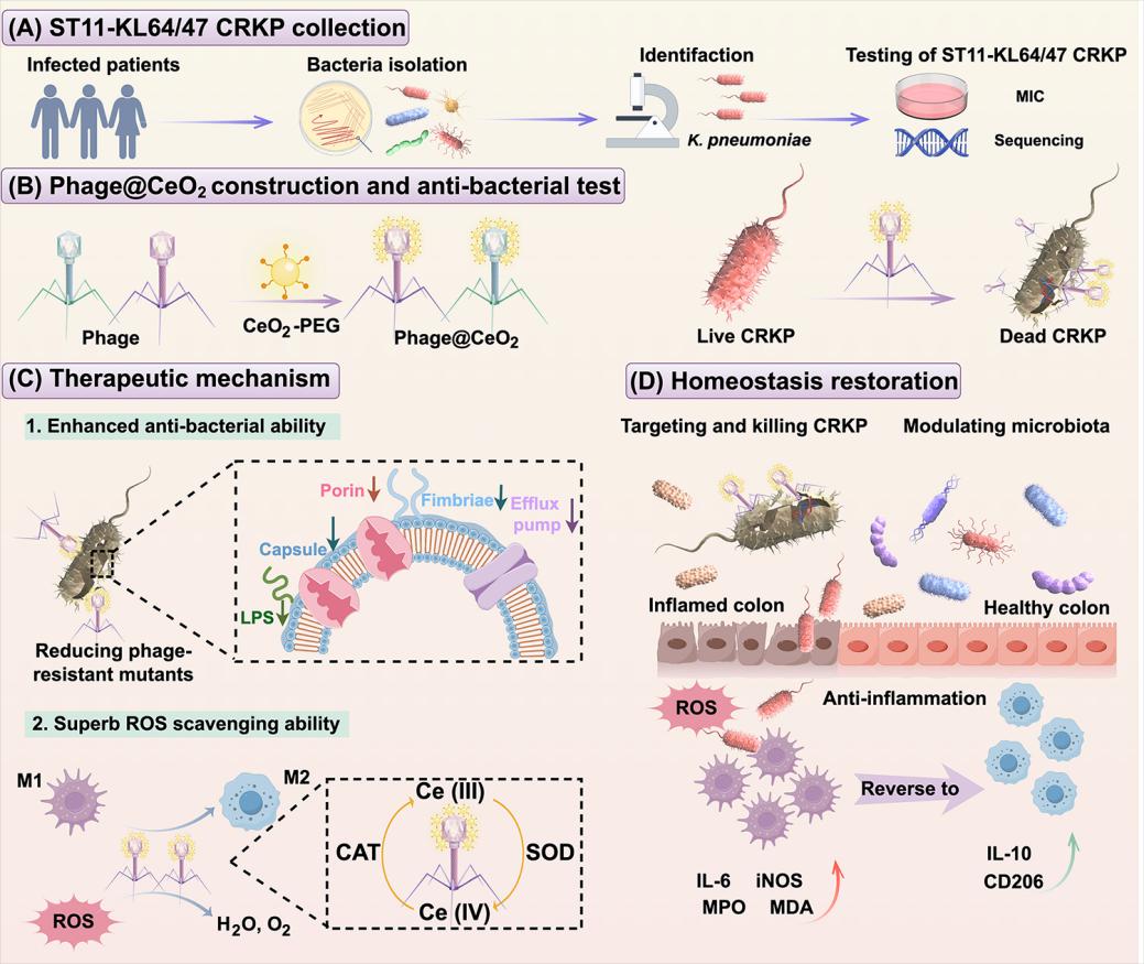 炎症性肠病(Inflammatory bowel disease,IBD)是一种自身免疫性炎症性疾病,其特征是不受调节的固有和适应性免疫反应导致持续的组织损伤。当肠道微生物群紊乱时,耐碳青霉烯类肺炎克雷伯菌(Carbapenem-resistant Klebsiella pneumoniae,CRKP)倾向于在结肠定植,并在遗传易感的宿主中引起严重的肠道炎症。噬菌体作为潜在抗菌药物替代疗法,已在多国获批用于治疗耐药菌感染的临床试验。噬菌体凭借靶向细菌的特性,在治疗CRKP感染的IBD中展现出可局部复制和调节菌群等优势。但由于细菌对噬菌体的耐受性及IBD引发的肠道免疫紊乱,导致传统噬菌体疗法存在细菌清除效率降低与治疗失败的局限性。因此,增强噬菌体抗菌及清除活性氧的能力,可作为攻克感染性IBD的关键策略。