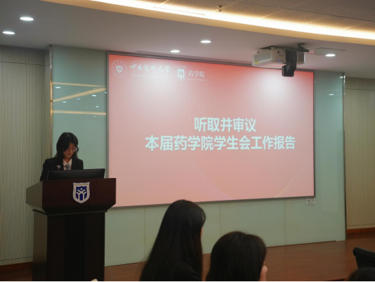 大会在庄严的国歌声中拉开帷幕。药学院学生会主席团成员卫润珅向大会作题为《锤炼实干担当作风,厚植贴心服务情怀,在为强国建设谱写新篇的实践中淬炼青春良药》的工作报告。报告实事求是地总结了第十七次学代会以来我院学生会工作取得的主要成绩与经验,明确指出了今后一年的工作目标和努力方向,并对未来学生会的建设和发展作了全面部署。