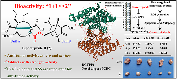 茜草是我国传统常用中药,具有重要药用价值。该团队综合利用OSMAC、代谢组学和分子网络可视化等技术从茜草内生真菌中分离得到系列具有新颖骨架的terpene-nonadride异源二聚体及其单体。其中化合物bipoterpride B具有较好的体内外抗结直肠癌(CRC)活性,优于临床一线抗肿瘤药物5-氟尿嘧啶和顺铂。基于DARTS和蛋白质组学技术,该团队进一步研究发现bipoterpride B的潜在作用靶标,并利用生物信息学技术、临床样本等发现DCTPP1是治疗CRC的新靶标,同时证明bipoterpride B能够通过靶向DCTPP1发挥抗结直肠癌活性。上述工作涵盖了中药化学/天然药物化学研究的重要过程,包括化学分析、提取分离、结构鉴定、活性筛选、体内评价及靶标机制等方面研究,丰富了天然产物结构多样性,为结直肠癌提供了新的治疗靶标,同时还发现了首个靶向DCTPP1的抗结直肠癌天然抑制剂,为抗肿瘤药物研究提供了潜在的候选分子。