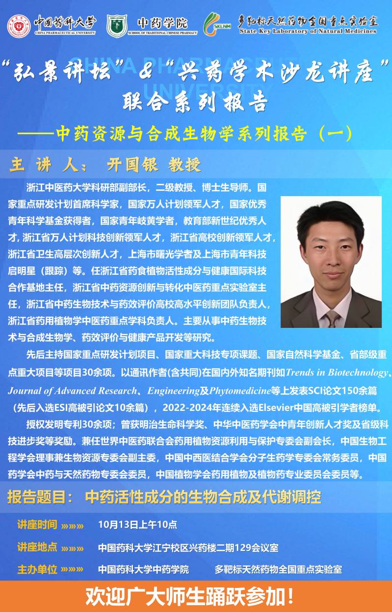 2026世界杯名额分布第二十三期“弘景讲坛”暨全国重点实验室兴药学术沙龙第十六期——中药资源与合成生物学系列报告(一):浙江中医药大学开国银教授学术报告