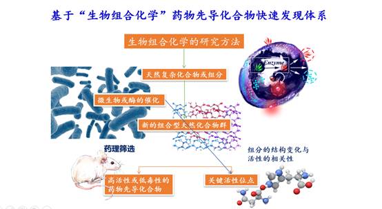 对具有明确生物活性天然复杂化合物或活性组分,通过微生物或者或酶的催化修饰产生新的组合型天然化合物库;结合药理筛选及活性物质结构鉴定,发现新的高活性或低毒性的天然活性先导化合物,或通过对活性组分中不同成分结构变化与活性相关性分析发现关键活性位点,结合化学修饰发现新的先导化合物。利用该技术已发现多个药物先导化合物,其中两个先导化合物的新药研究获得重大新药创制专项资助。